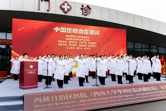 随后,西藏自治区医院(四川大学华西医院西藏医院)院长陈蕾带领医务人员宣誓,铿锵有力的誓言,彰显医院全体职工献身医学事业、全心全意服务人民健康的坚定信念。